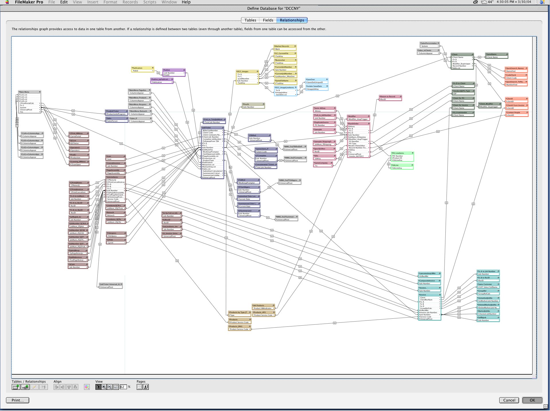 In Spring of 2004, to explore FileMaker 7, I rewrote the entire NY side of the DCC system from scratch as a single-file 13-table FileMaker 7 solution. (Due to the ongoing use of MacOS 9 on many machines at DCC, this was not a version that was actually used. FileMaker 6 is the last version of FileMaker to run under MacOS 9). I also converted some existing solutions from FileMaker 6 to 7, verifying / repairing file references as need be. FileMaker 7 offered the ability to separate data from the majority of structure (one can have all the screens and scripts in a file separate from the file containing the data tables) as well as some impressive and convenient new function calls.