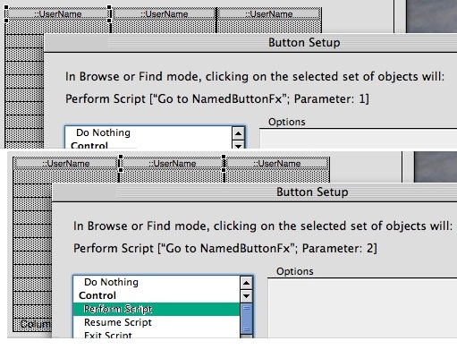 Button Scripts -- In FileMaker 6, you needed a different script to handle even minor variations on desired behavior. In FileMaker 8, you can pass along a script parameter attached to the actual button, so a single script in FileMaker 8 can do the work of a whole raft of scripts in FileMaker 6. In this illustration, personnel are divided up into departments, and each person has a button that brings up their tasklist. The buttons do identical things except for the relationship that separated personnel by department. In FileMaker 6, a separate script was needed for each department (see illustration on left); in FileMaker 8, one suffices.