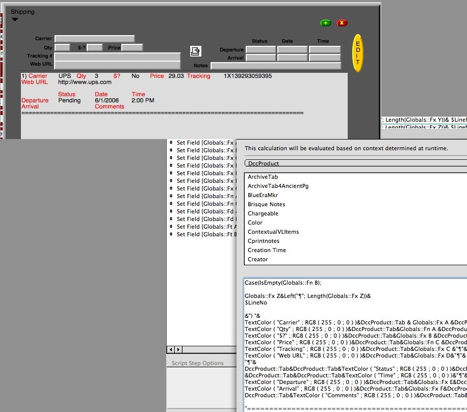 Users enter several packages and the data is not actually written to new records until they exit this screen. Temporary data cached in FileMaker 8 parameters for easy parsing into actual fields later, but is also written to a text global field for the user to view onscreen during data entry.
