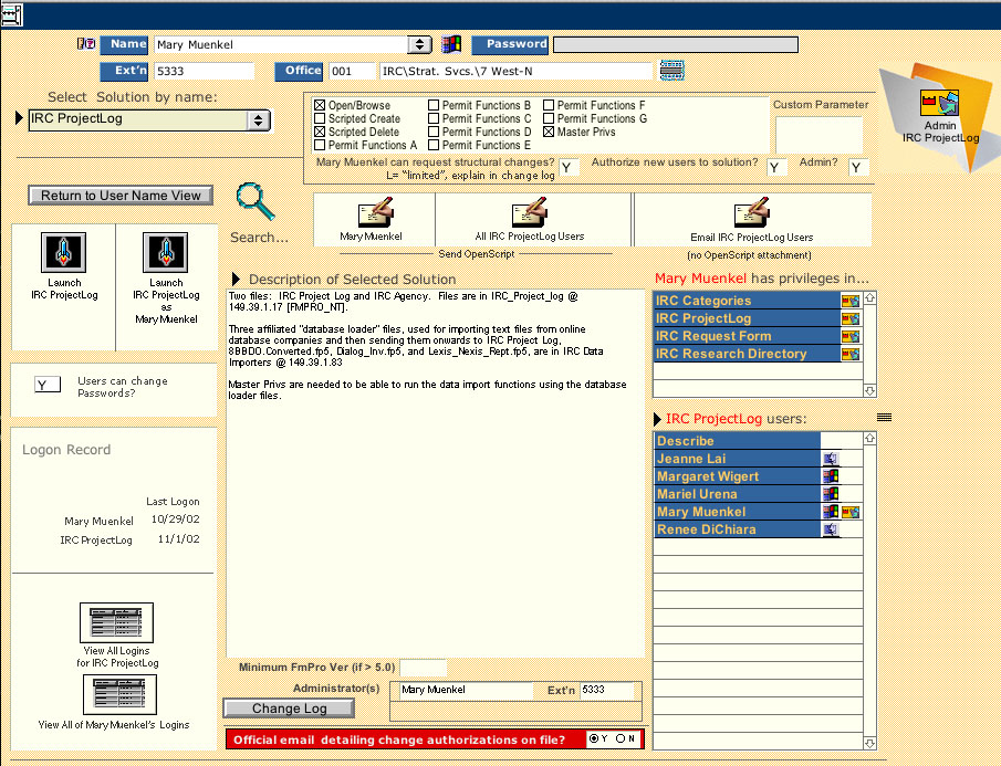To address this situation at BBDO, where we ran and supported over 60 solutions for nearly 300 users, I created a system to work in conjunction with the built-in FileMaker security, one in which all privilege differences other than those distinguishing programmers from end users were assigned through a logon process written into a database file.