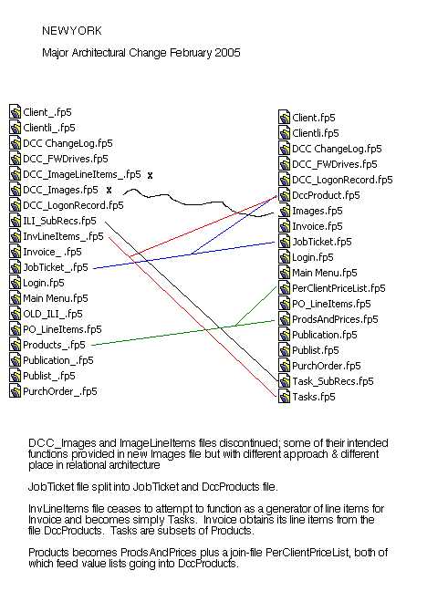 In the first phase, its "diary-like" comments, long (mis)used as the actual dialog between production supervisors and image operators, were replaced with a sub-line-items file and the "products" were replaced with task-oriented, deparment-specific workflow-driven items. But to make the system useful for the financial department, I split JobTicket into a Job part and and Products part. The new Products part consisted of billable items and those in turn contains the workflow tasks. What didn't work in an architecture where the same file was attempting to serve two purposes works far better in the new architecture with separate but hierarchically-related files attending to the two tasks.